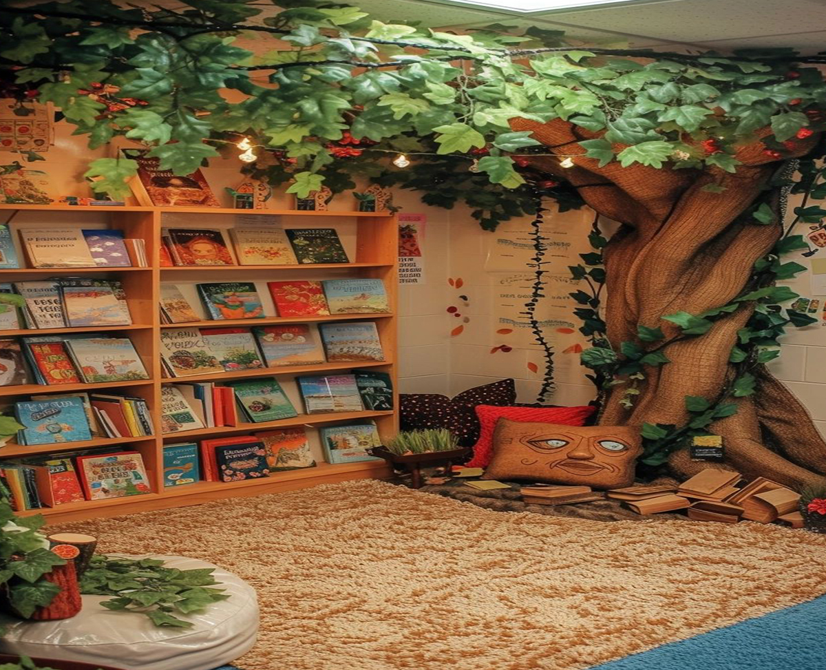 Symbolic Displays: Bee-themed literacy corner or rainbow cushions for diversity.