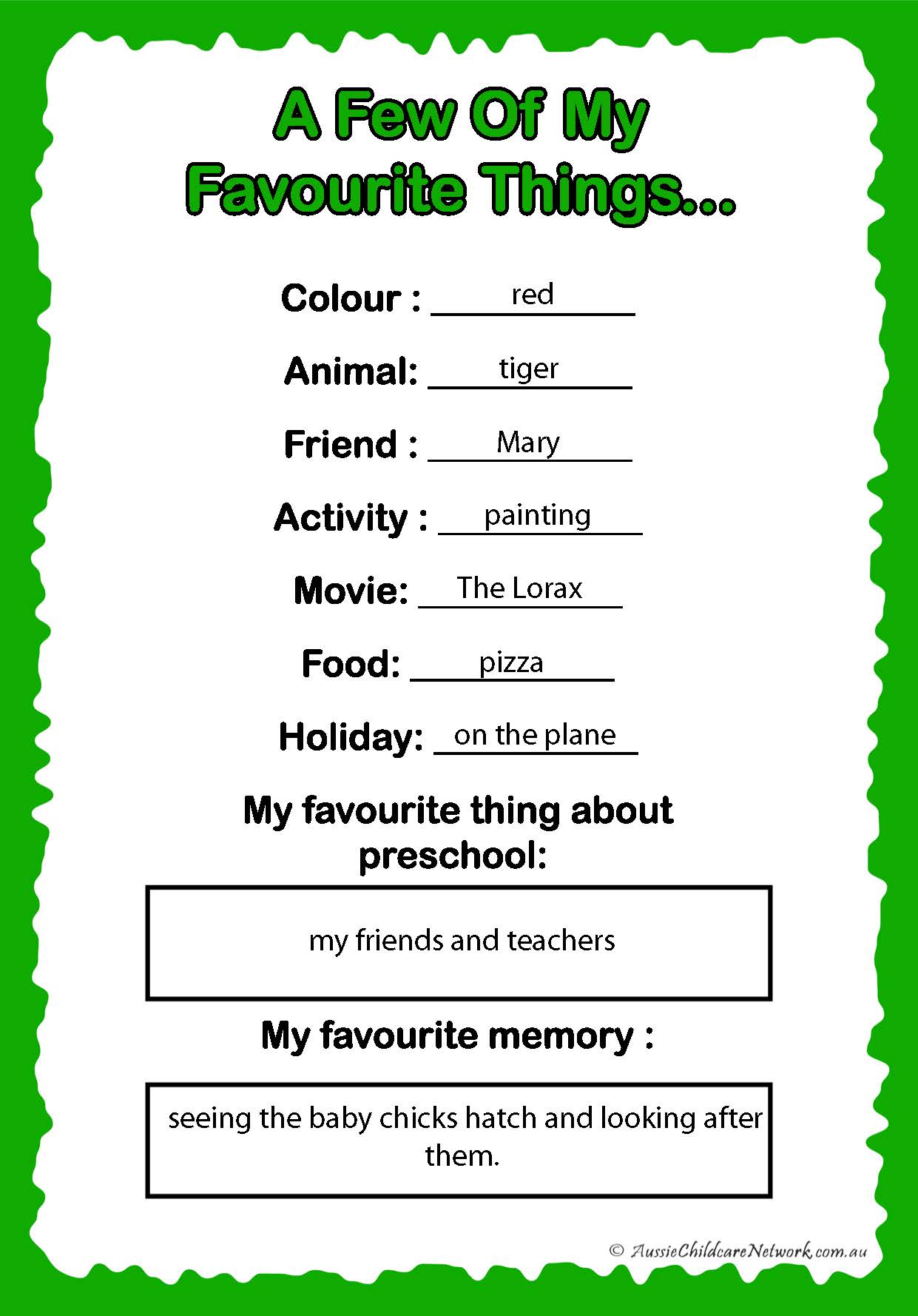 - A Few of My Favorite Things—Children share their favourite foods, colours, activities, and more—offering families a snapshot of their child’s preferences and personality.