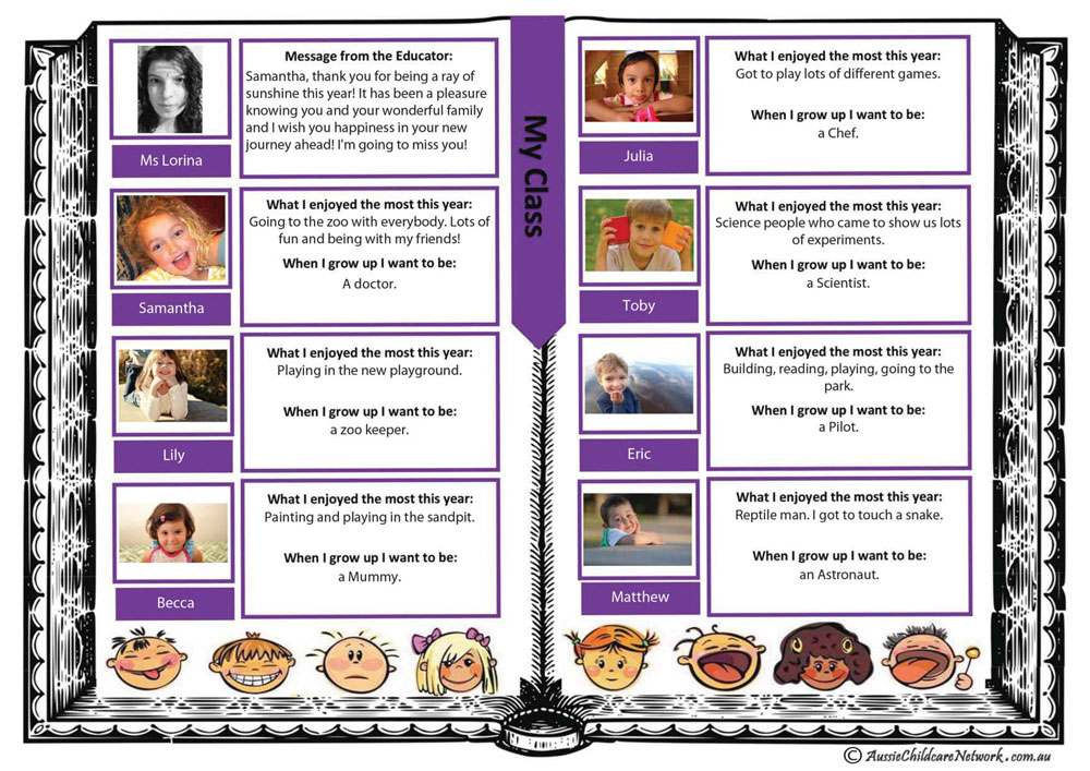 Includes the child’s name, centre name, educators, and the year setting the tone for a personalized experience.