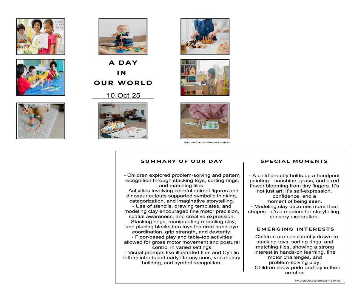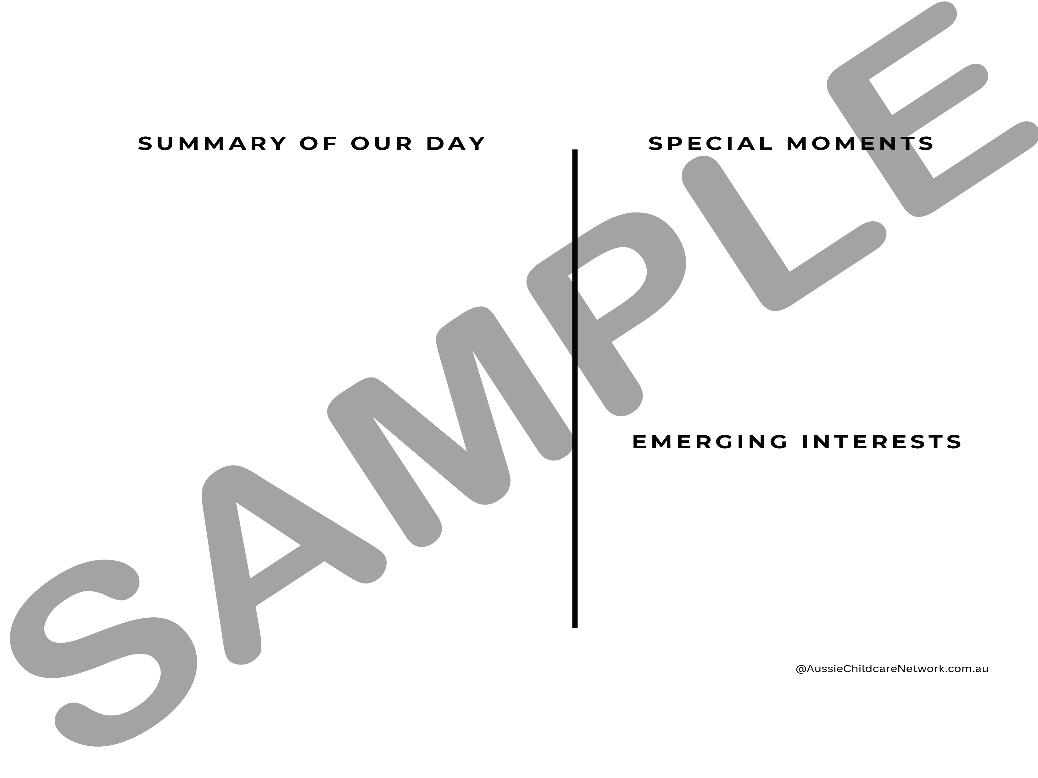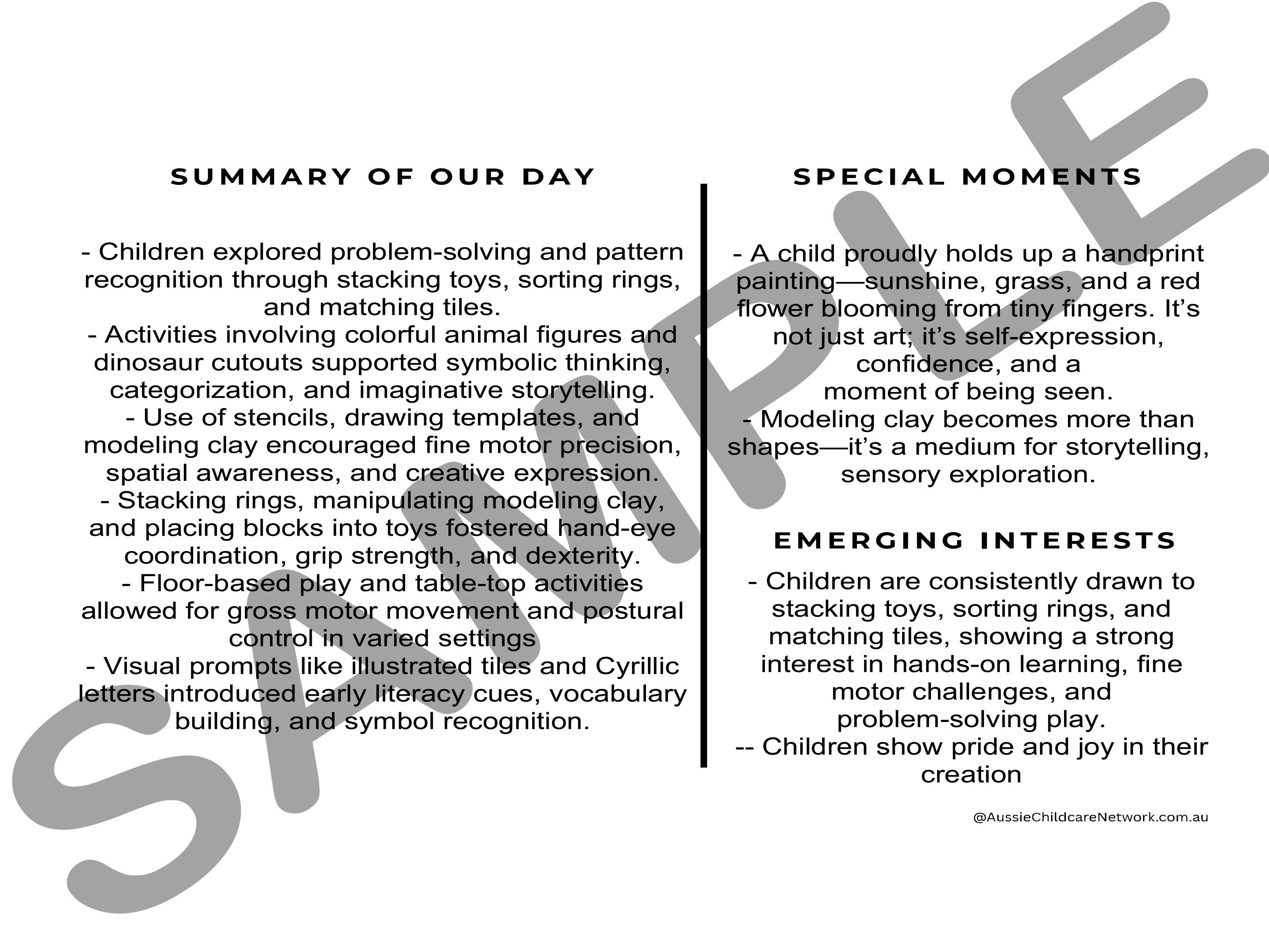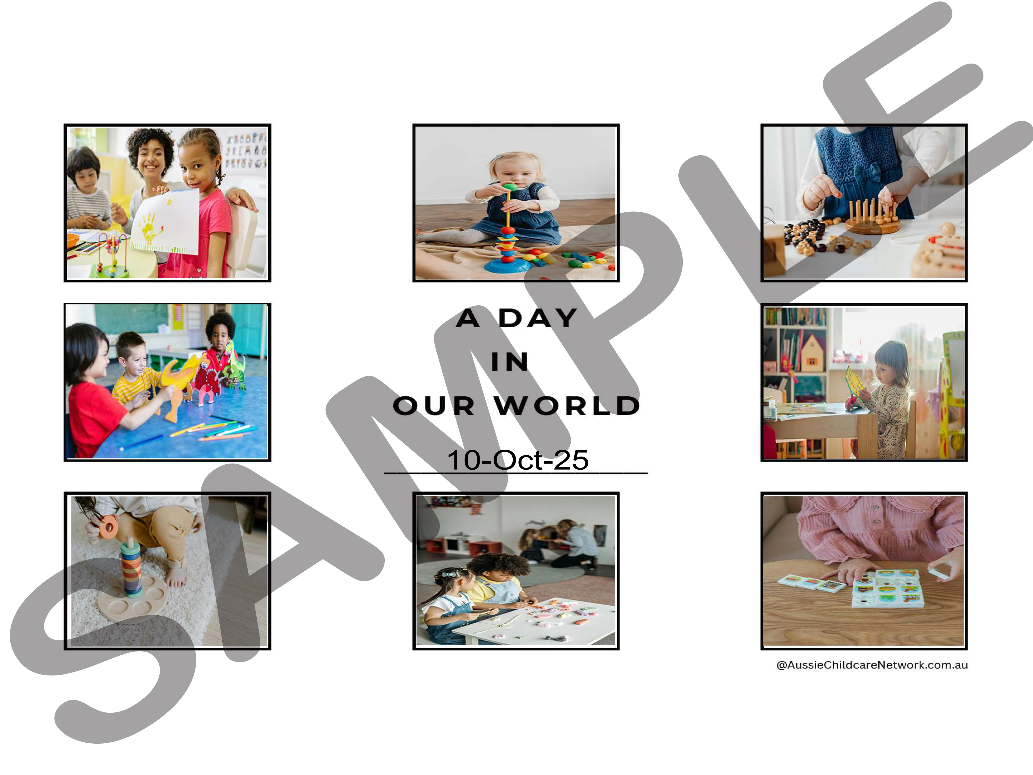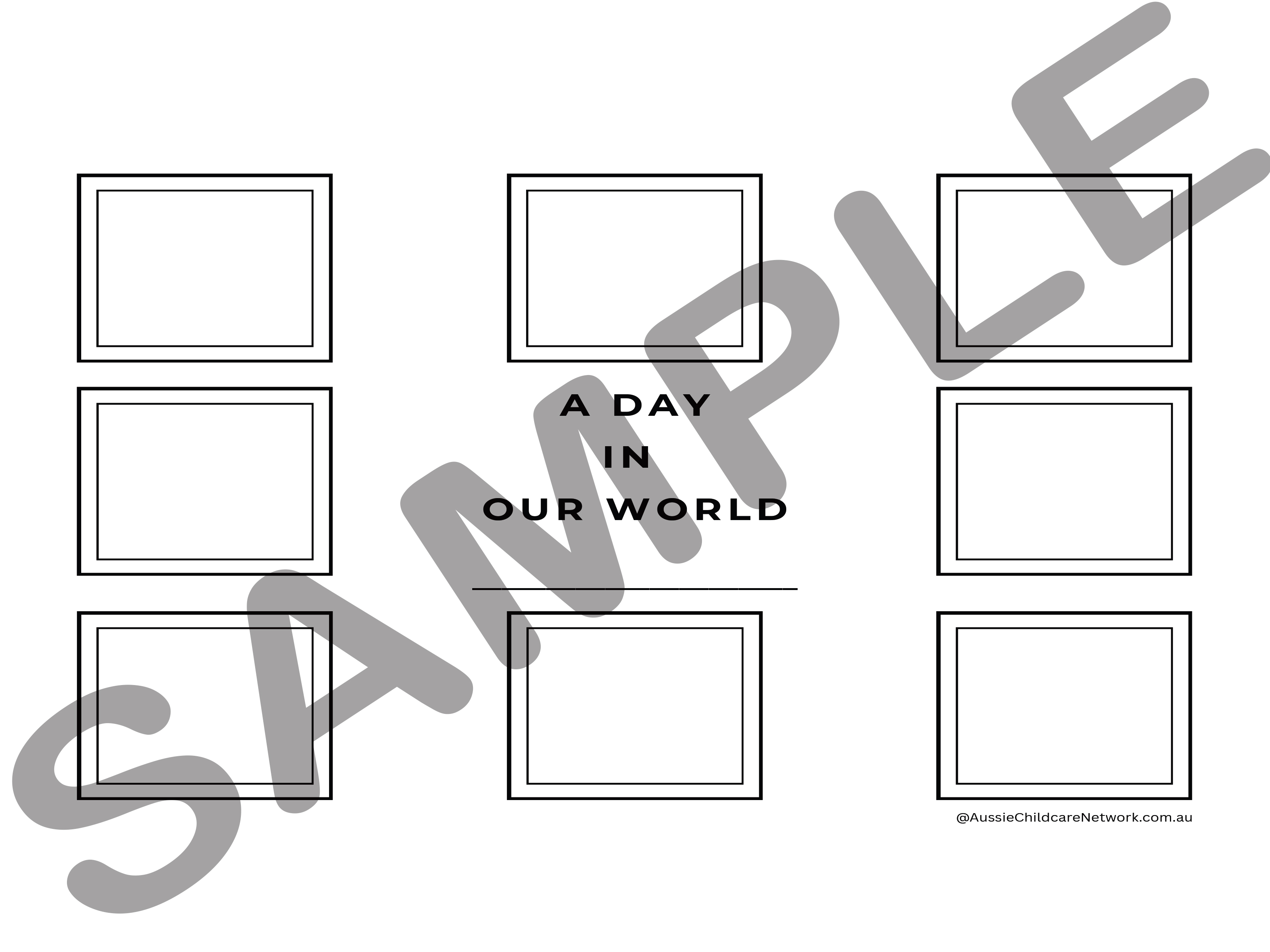 The A Day In Our World template is a reflective documentation template designed to help educators capture the richness of children’s daily experiences. With space for eight photos, a warm summary of the day, and special moments, this format invites educators to celebrate voice, curiosity, and connection. It supports storytelling that is both authentic and professional—highlighting spontaneous play, emerging interests, and meaningful interactions. This template includes: