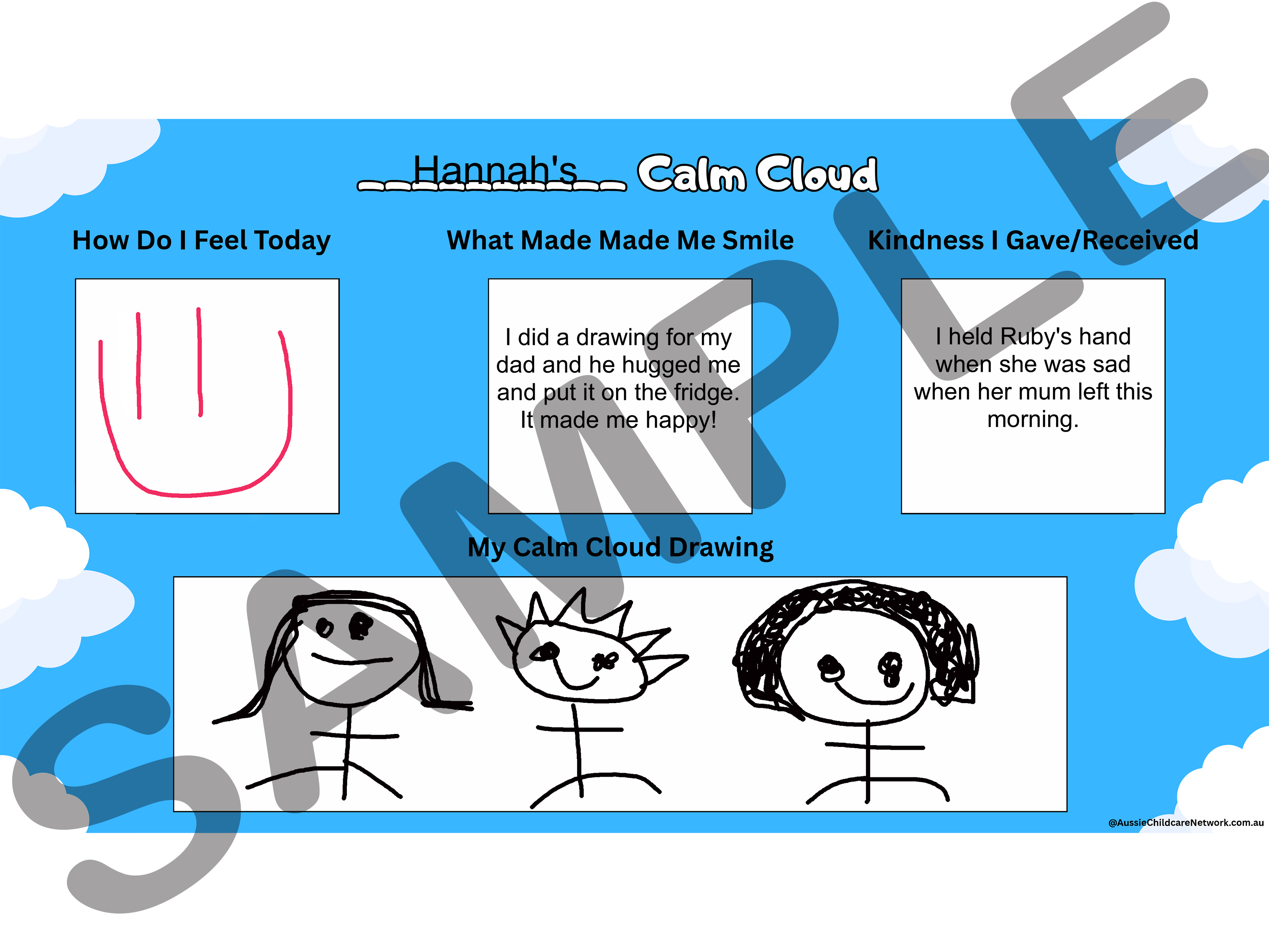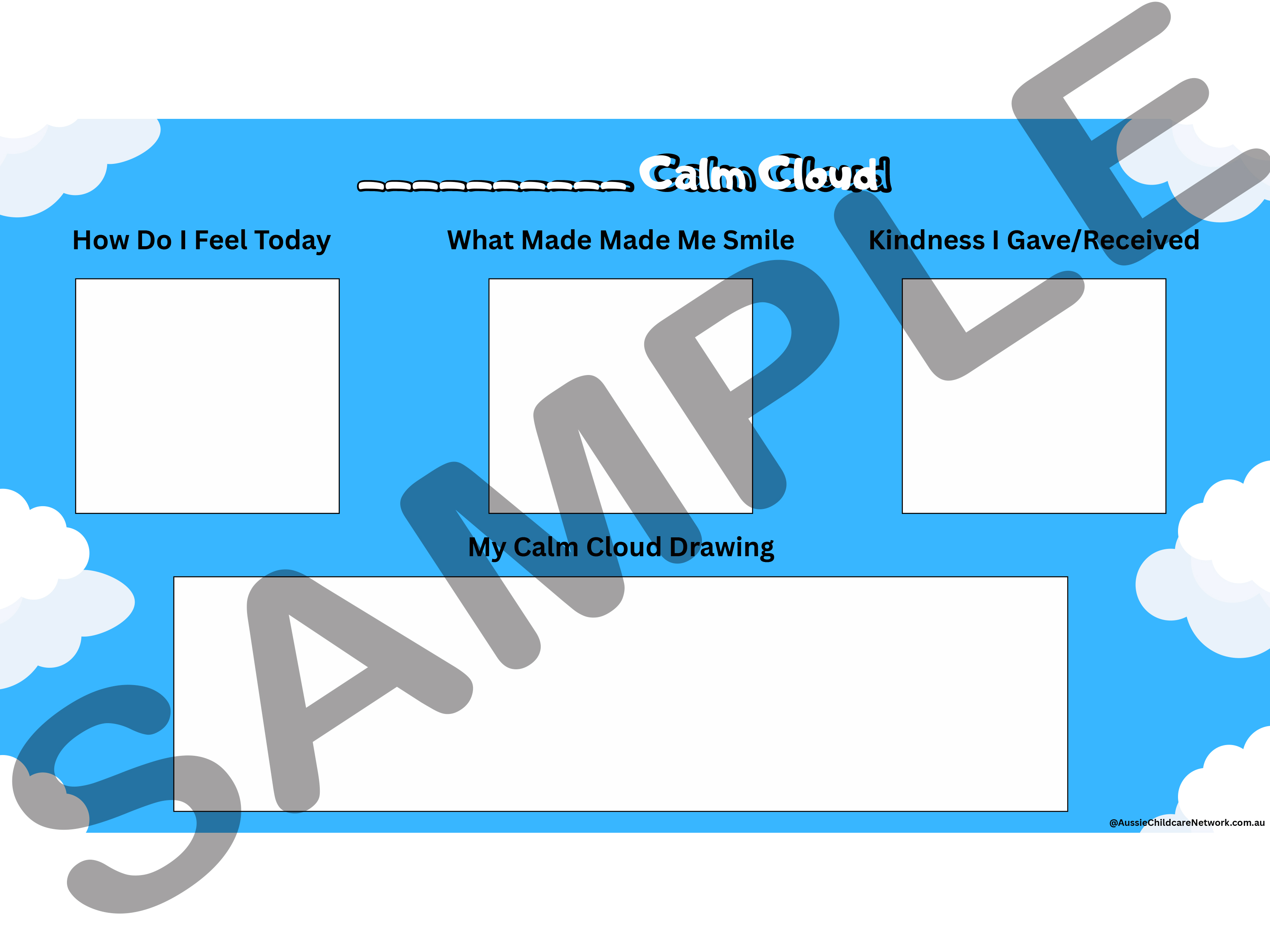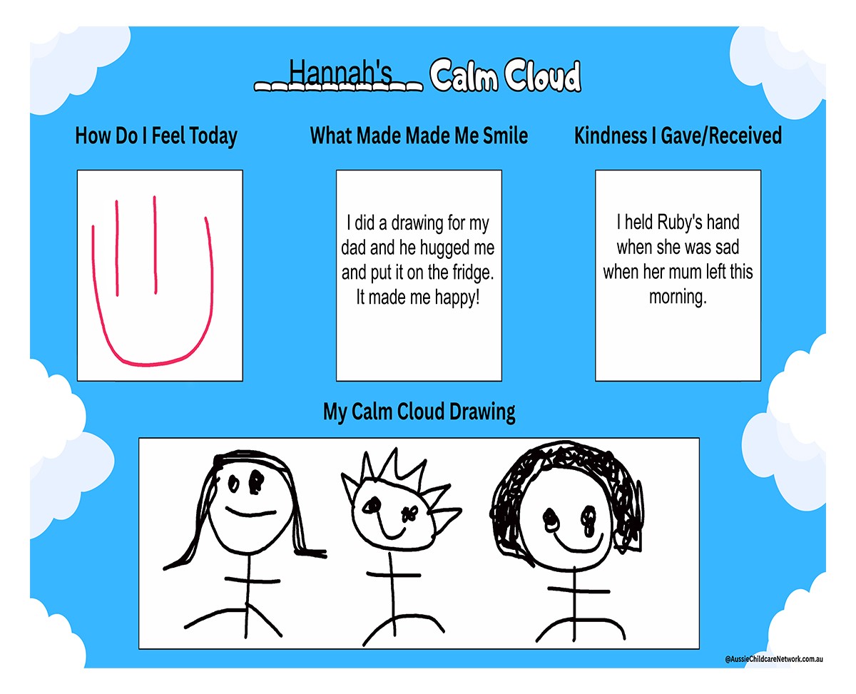 The Calm Cloud template invites children to visualize and create their own calm cloud as they begin to build emotional literacy and self-soothing strategies. This approach nurtures a sense of agency and emotional safety, allowing children to express feelings without judgment and to access calming imagery when overwhelmed. Whether used during transitions, after big feelings, or as part of daily reflection, the Calm Cloud supports emotional resilience, fosters self-awareness, and strengthens a child’s ability to pause, breathe, and reconnect with their inner calm. Children have the option of drawing in each box rather than Educators adding text. This template includes: