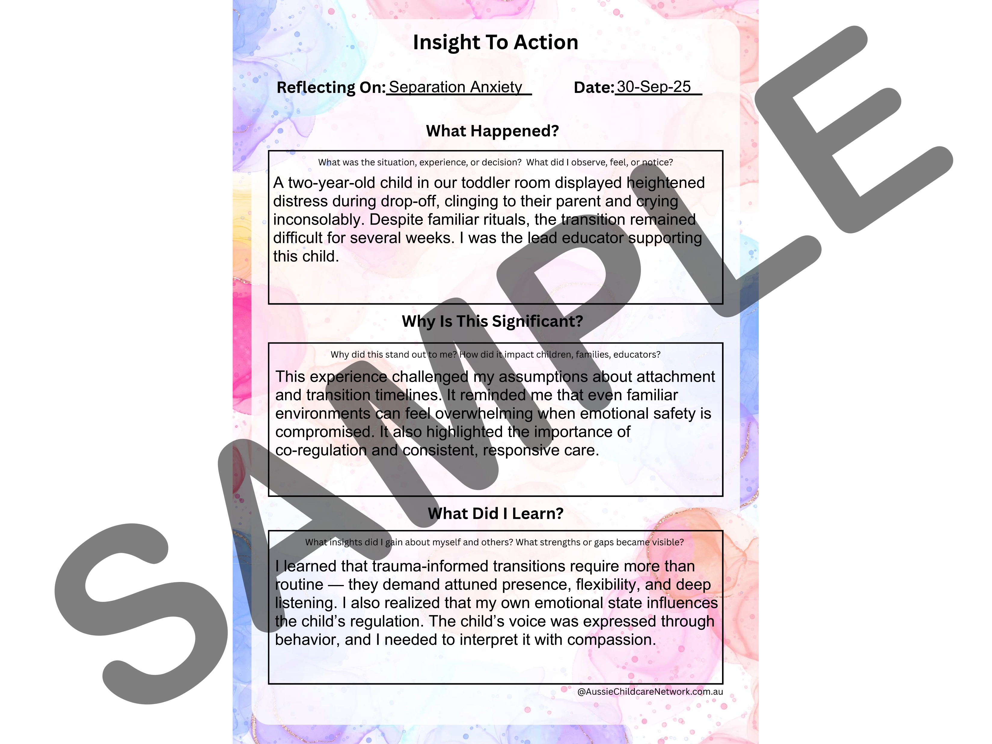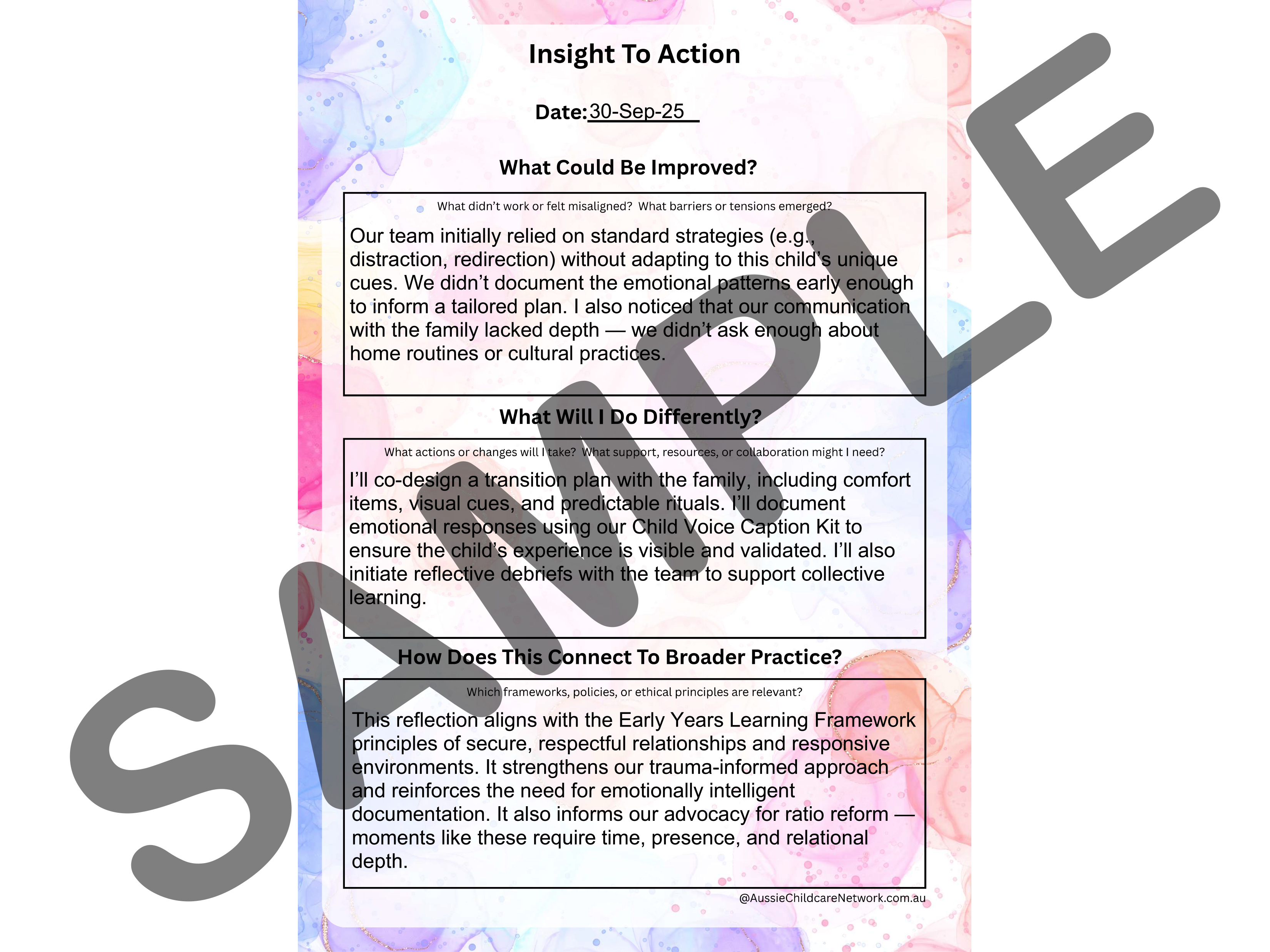 Whether you're reflecting on child interactions, team dynamics, compliance challenges, or wellbeing initiatives, this template helps you pause, unpack, and grow. Each prompt invites you to explore not just what happened, but why it mattered, what it taught you, and how it connects to broader principles like emotional safety, authentic child voice, and ethical practice.